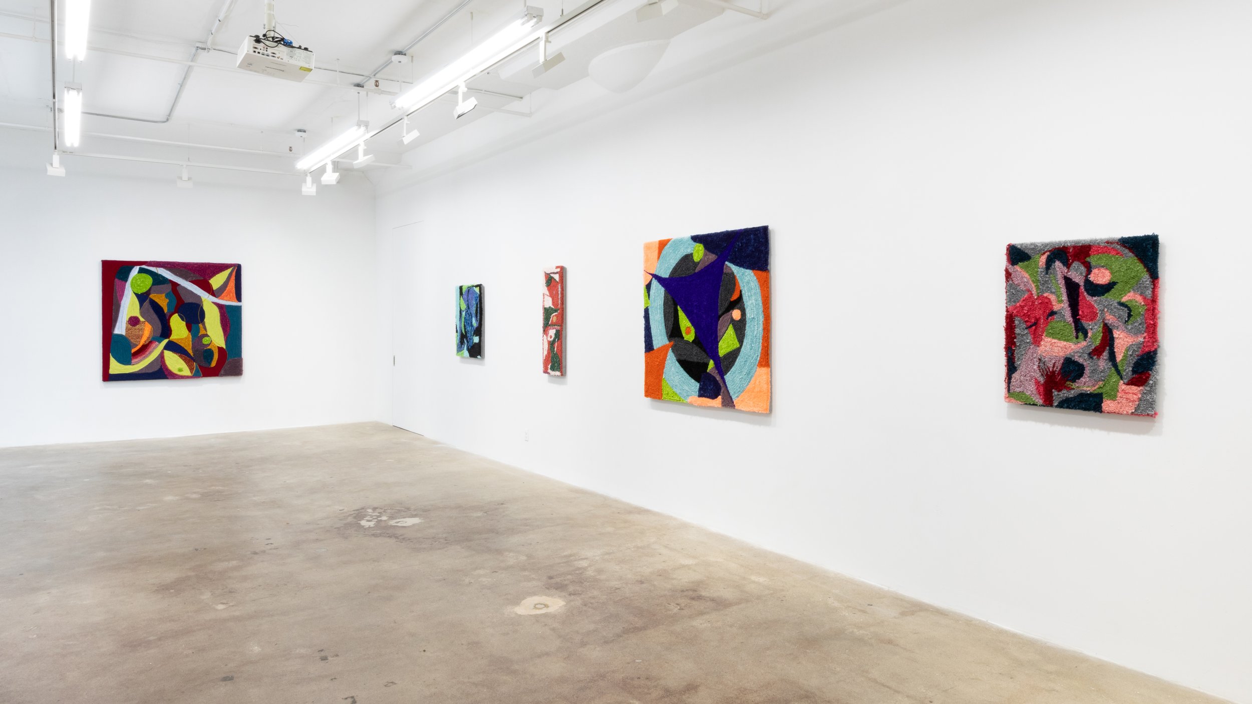 Throughout her multi-disciplinary practice, Davis includes elements of painting, voice, and craft. For these paintings, Davis explores how a radical sonic framework for improvisation can inform an embodied practice for object-making. Using industrial tufting machines as drawing instruments, Davis creates abstract, richly-hued compositions with yarns that are threaded together for their ability to make new tones and textures. Filled with blossoming shag piles and soft curling loops, Davis’s paintings put forth a voluminous cacophony of geometric and organic shapes, coupled with gestural strokes. Invoking the vocabularies of sight, sound, and movement, Davis pushes the formal potential of yarn and the materiality of painting alike.